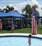 Nothing makes the Fourth of July better than a good race...Here's G and S (standing in the tubes) waiting for their turn in the relay-inner-tube races in the big pool. The boys won that one. The girls won the earlier race of pushing a greasted watermelon across the pool.